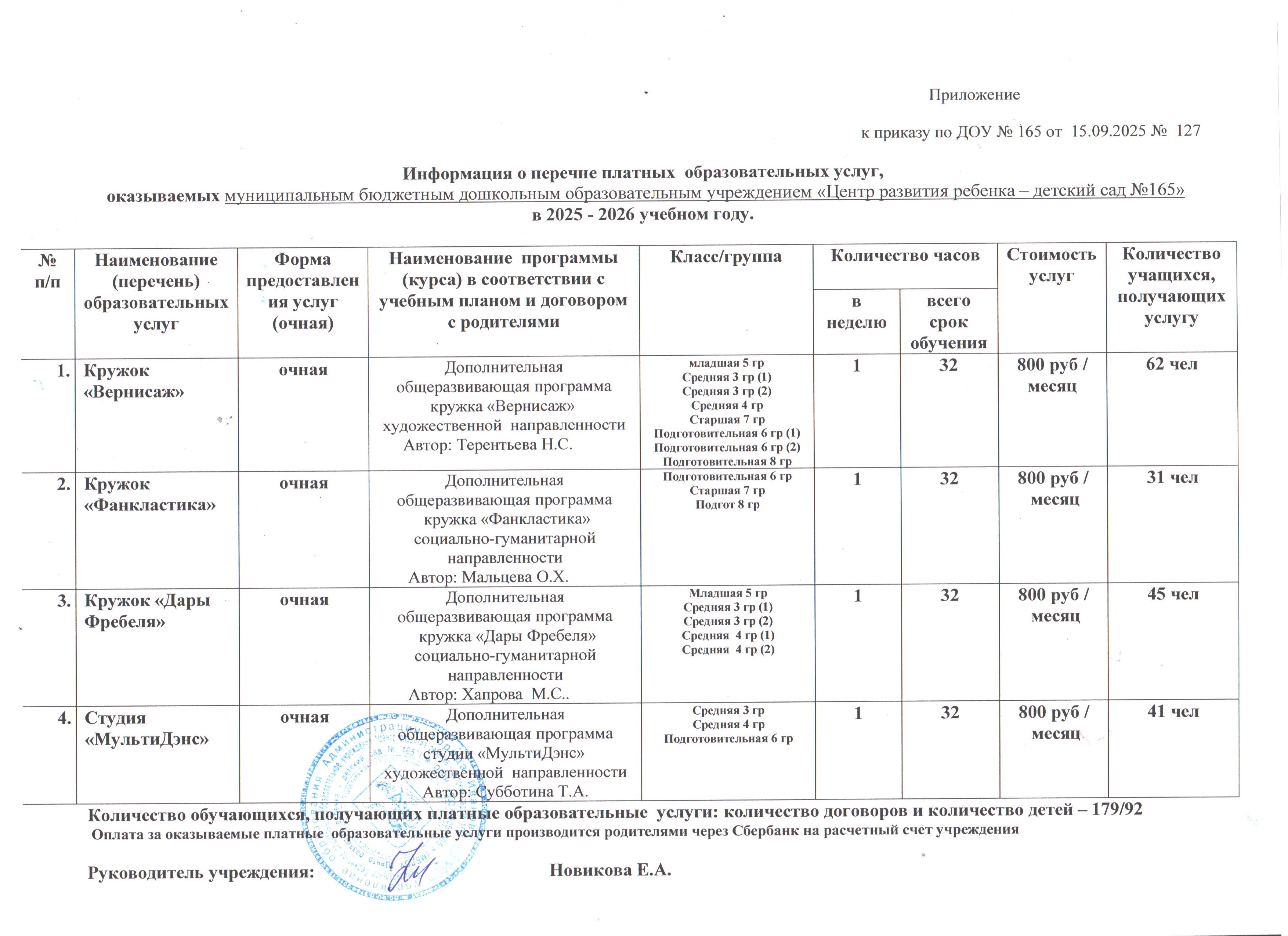 Платные образовательные услуги в ДОУ предоставляются в соответствии с основными документами: - Законом РФ от 07.02.1992 №2300-1 «О защите прав потребителей» - Федеральным законом №273-ФЗ «Об образовании в Российской Федерации» - Федеральным законом от 08.05.2010 №83-ФЗ «О внесении изменений в отдельные законодательные акты Российской Федерации в связи с совершенствованием правового положения государственных (муниципальных) учреждений» - Постановлением Правительства Российской Федерации от 15.09.2020 № 1441 «Об утверждении Правил оказания платных образовательных услуг» - Федеральный государственный образовательный стандарт дошкольного образования Содержание программ платных образовательных услуг способствует развитию детей дошкольного возраста. Программы обеспечивают целостность образовательного процесса, содействуют эффективному решению преемственности при постепенном переходе из одной возрастной группы в другую. Платные образовательные услуги для детей организуются за рамками освоения Образовательной программы дошкольного образования муниципального бюджетного дошкольного образовательного учреждения «Центр развития ребенка - детский сад №165» с понедельника по пятницу. Постановления о размере родительской платы в в муниципальных образовательных организациях города Иваново, реализующих образовательную программу дошкольного образования.